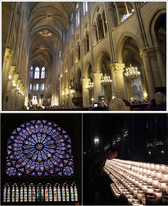 Interior Dalam Gereja Notre Dame (atas), Rose Window (Kiri Bawah)